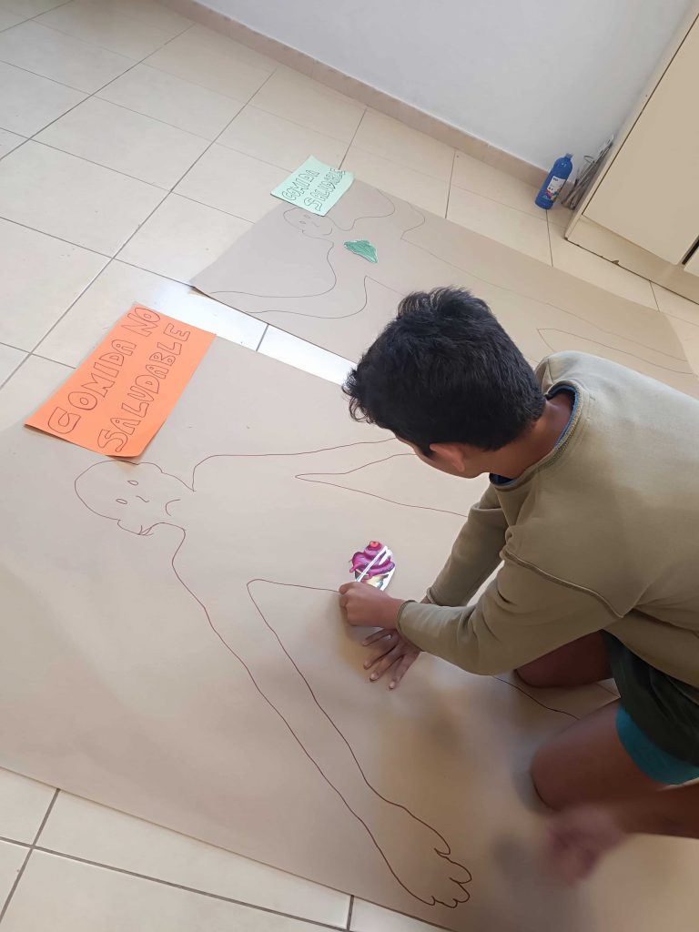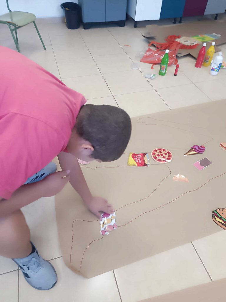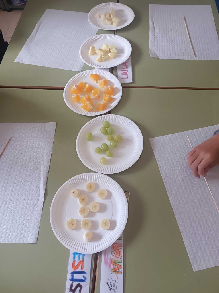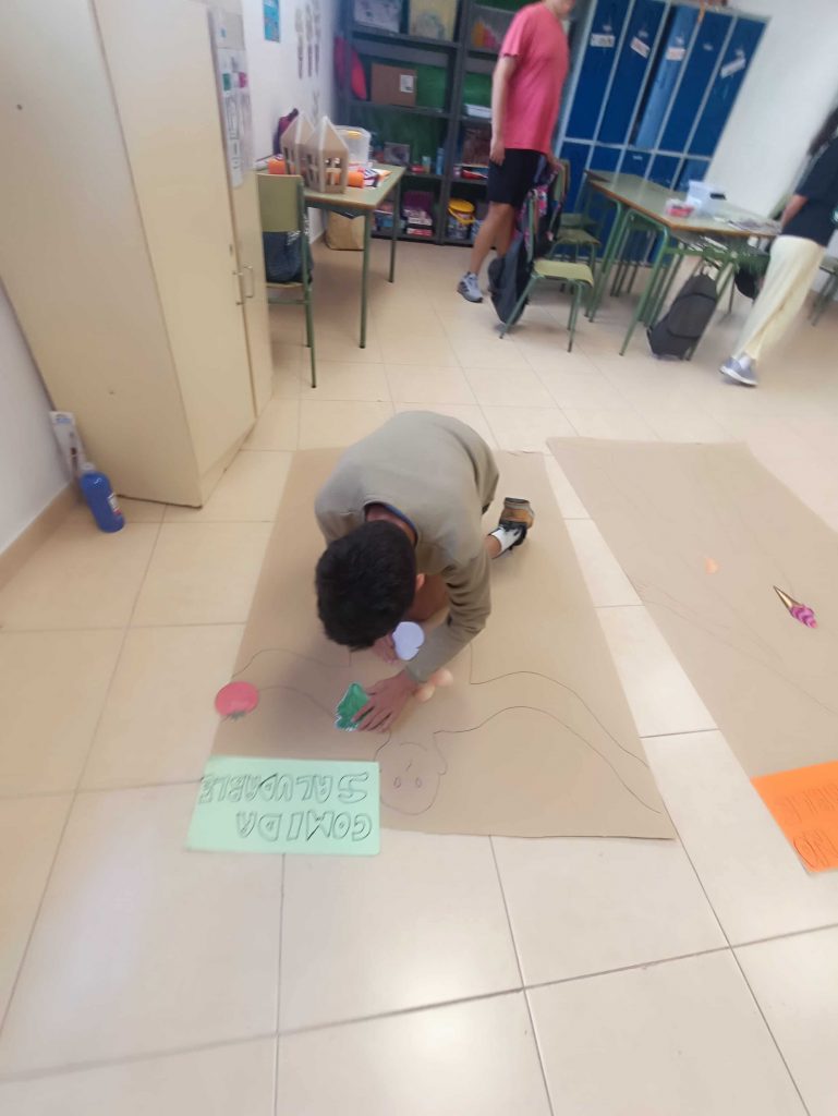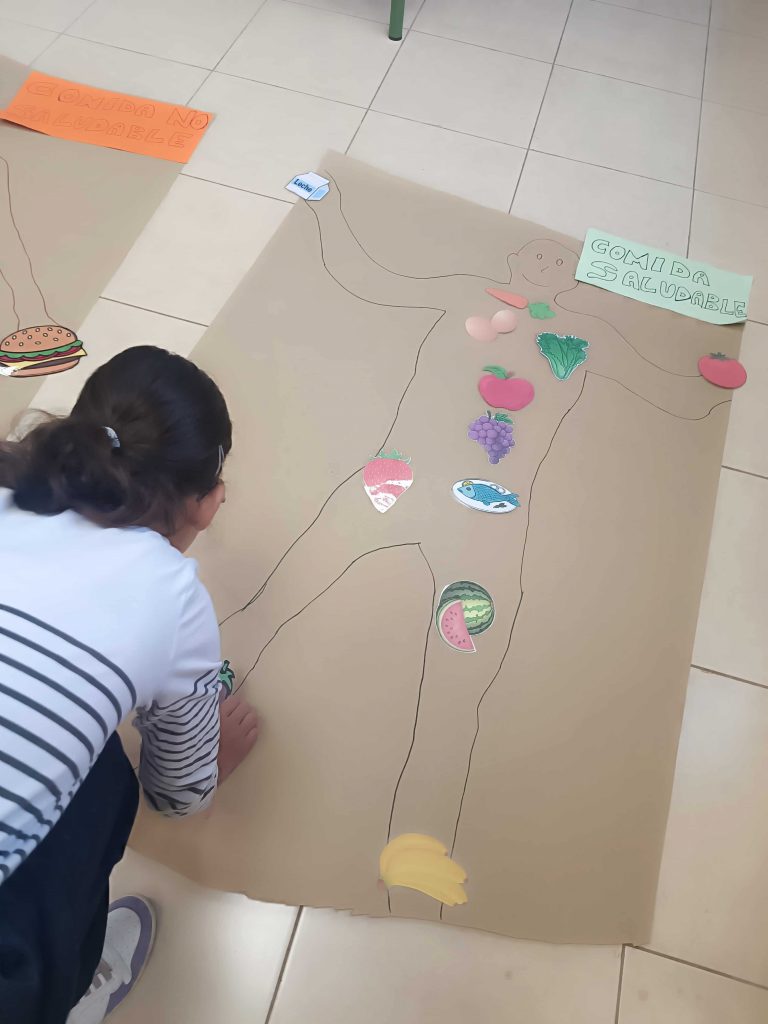 Realizaron dos grandes carteles con la silueta de sus propios cuerpos, para clasificar la comida entre la saludable y no saludable. Además, prepararon unas brochetas de fruta para disfrutar de una merienda sana.
