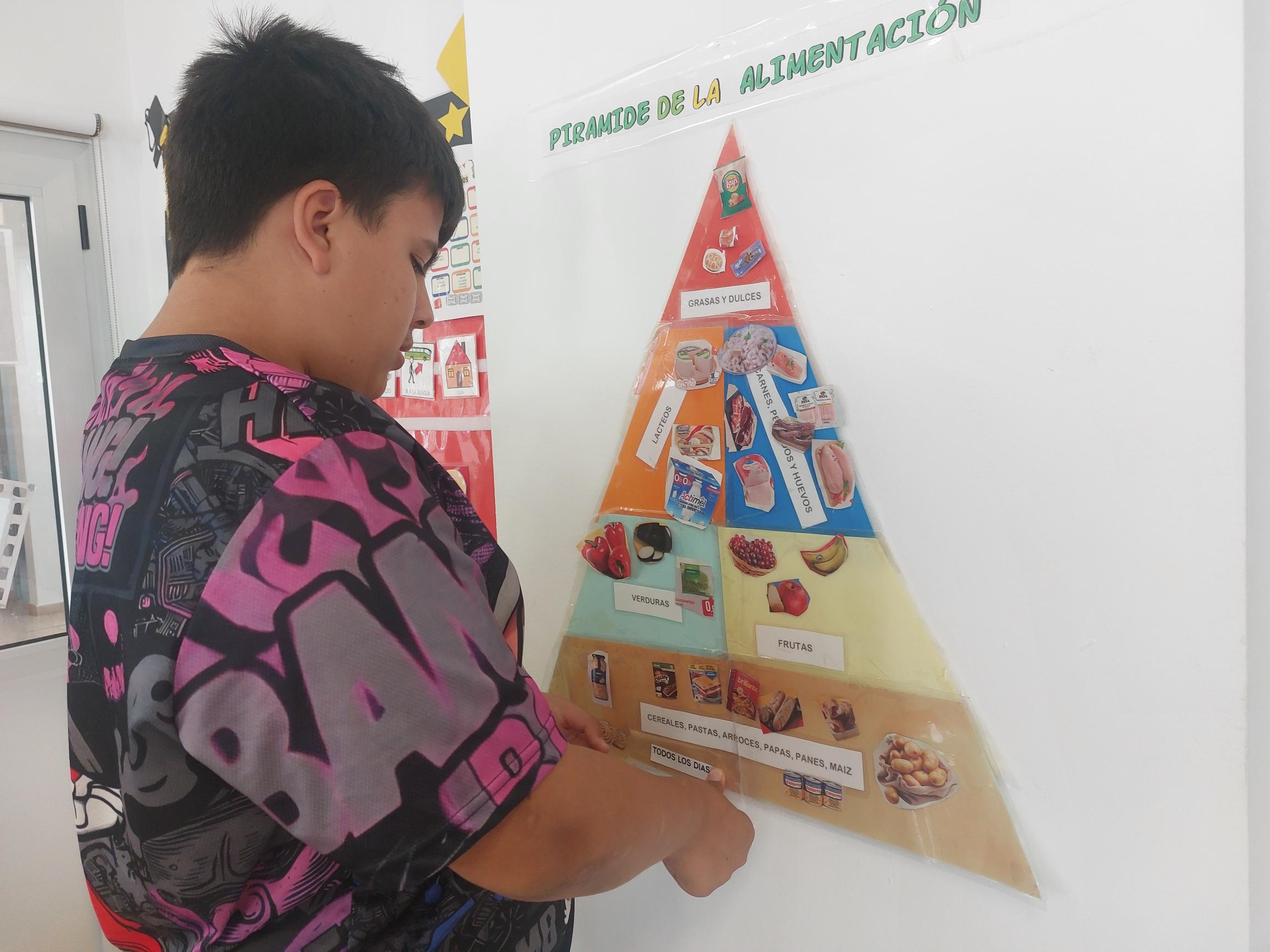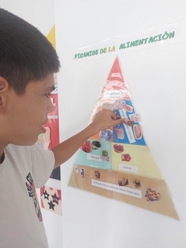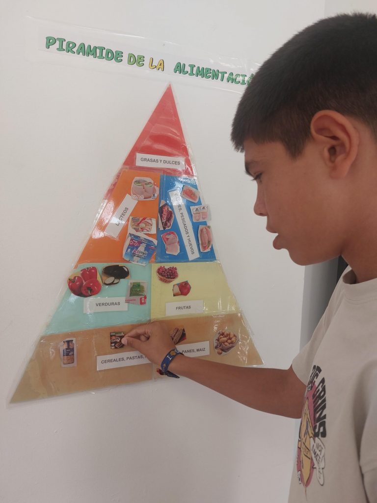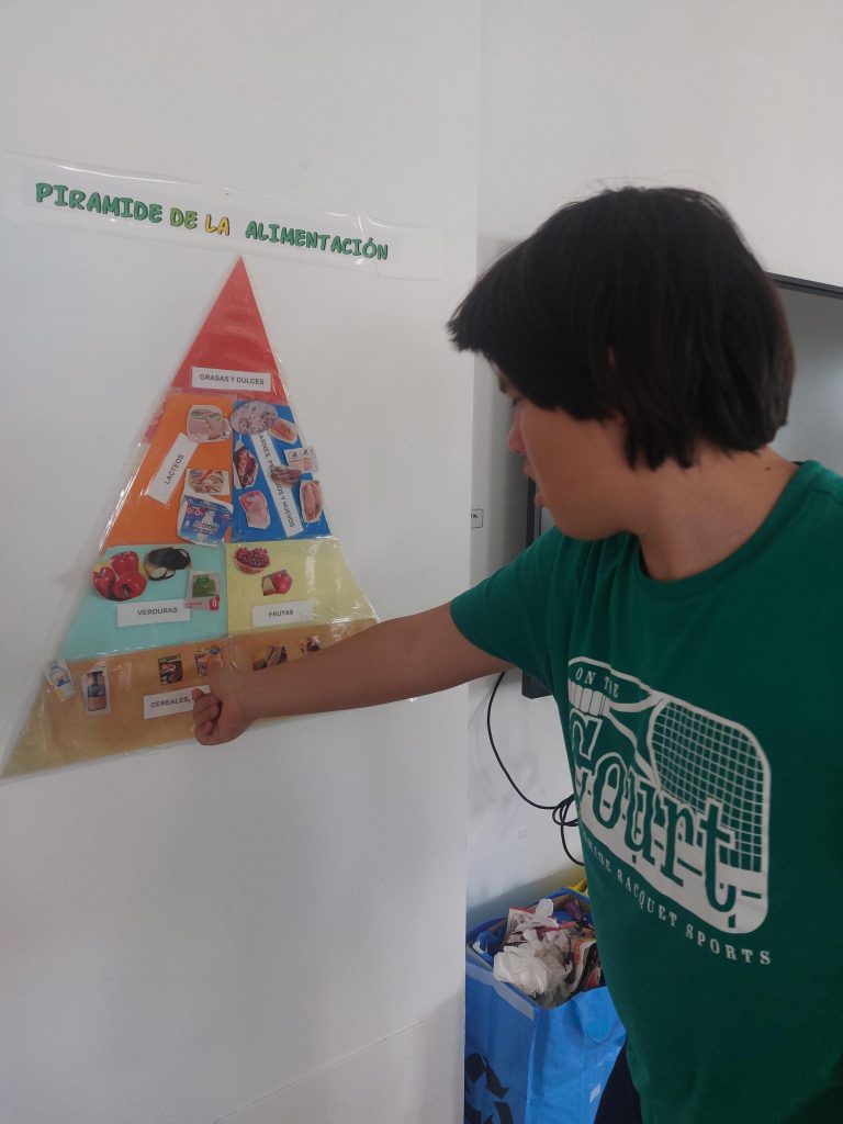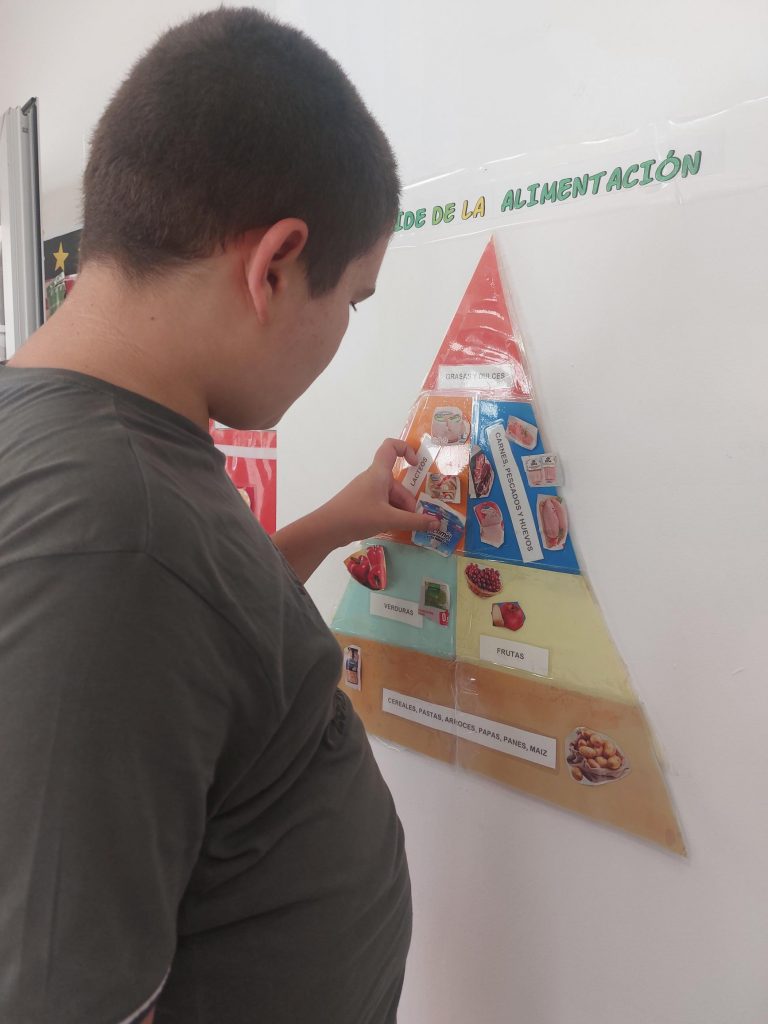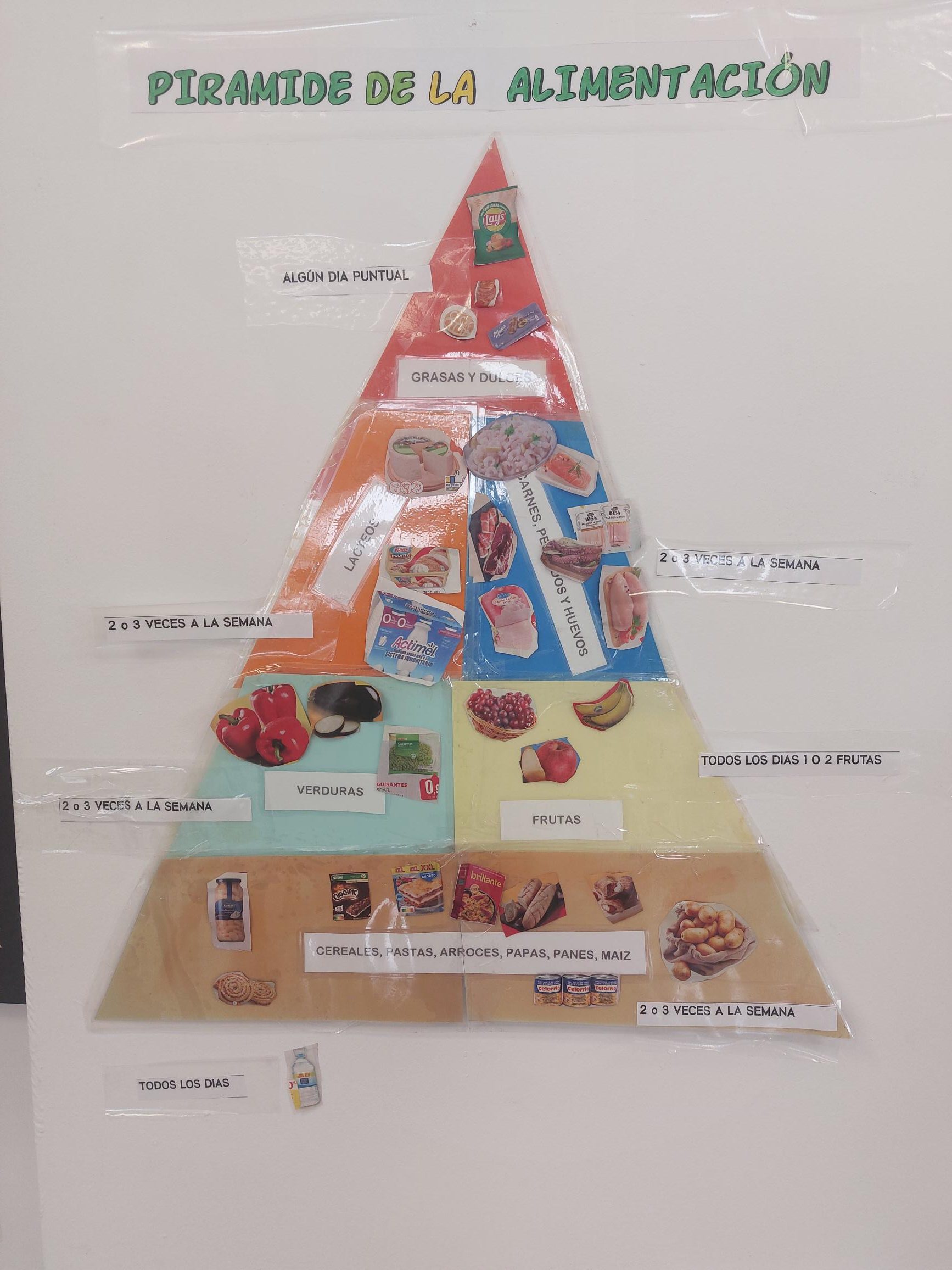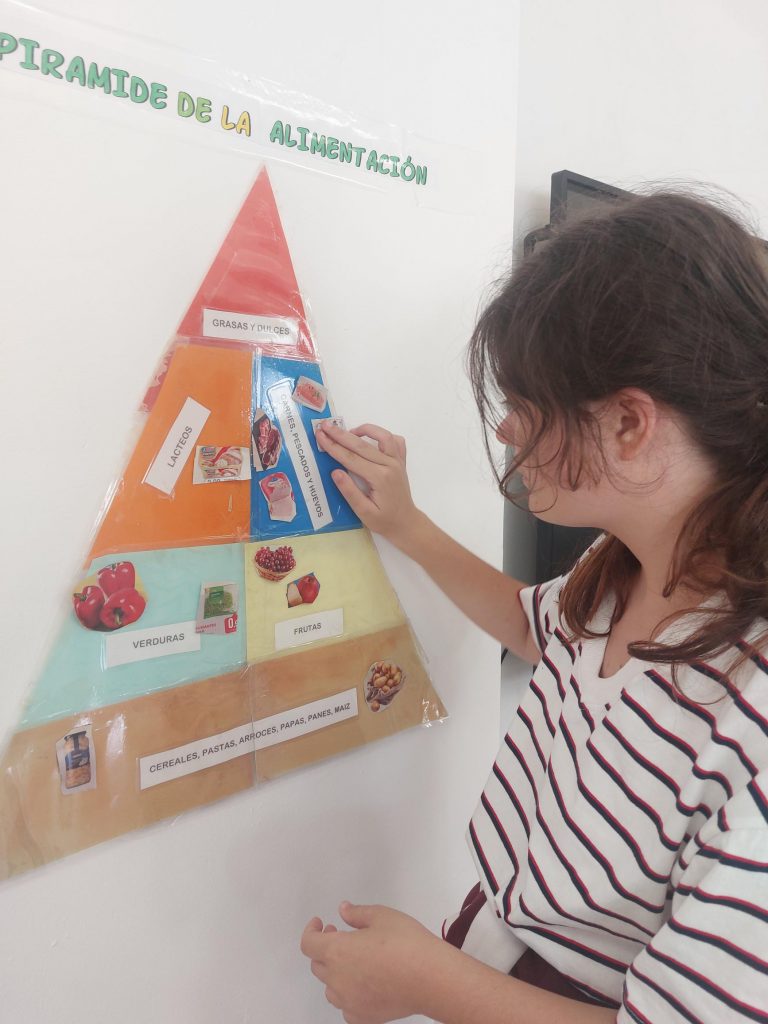 Cada alumno buscó, identificó y recortó diferentes alimentos para completar la pirámide de la alimentación entre todos.