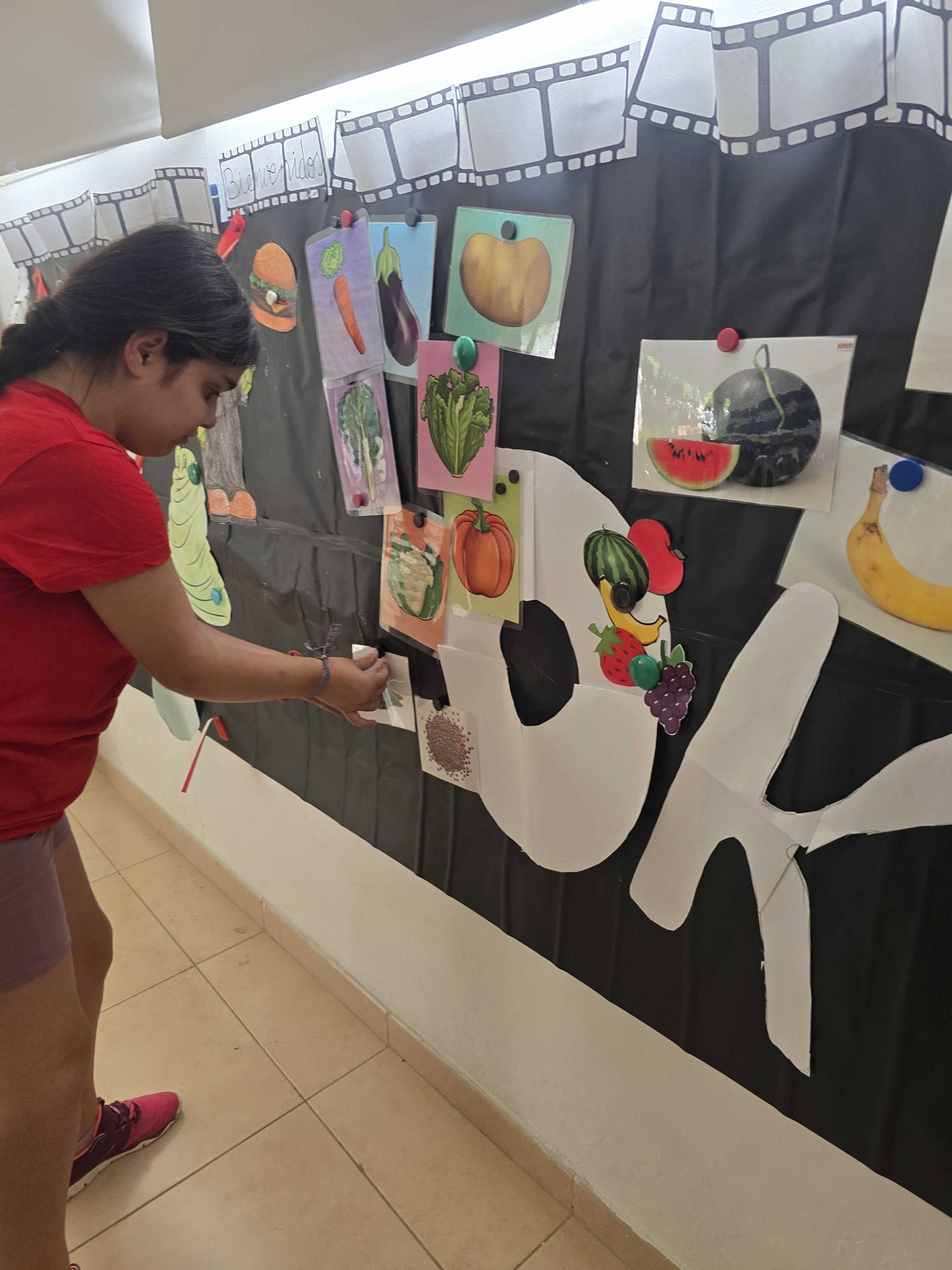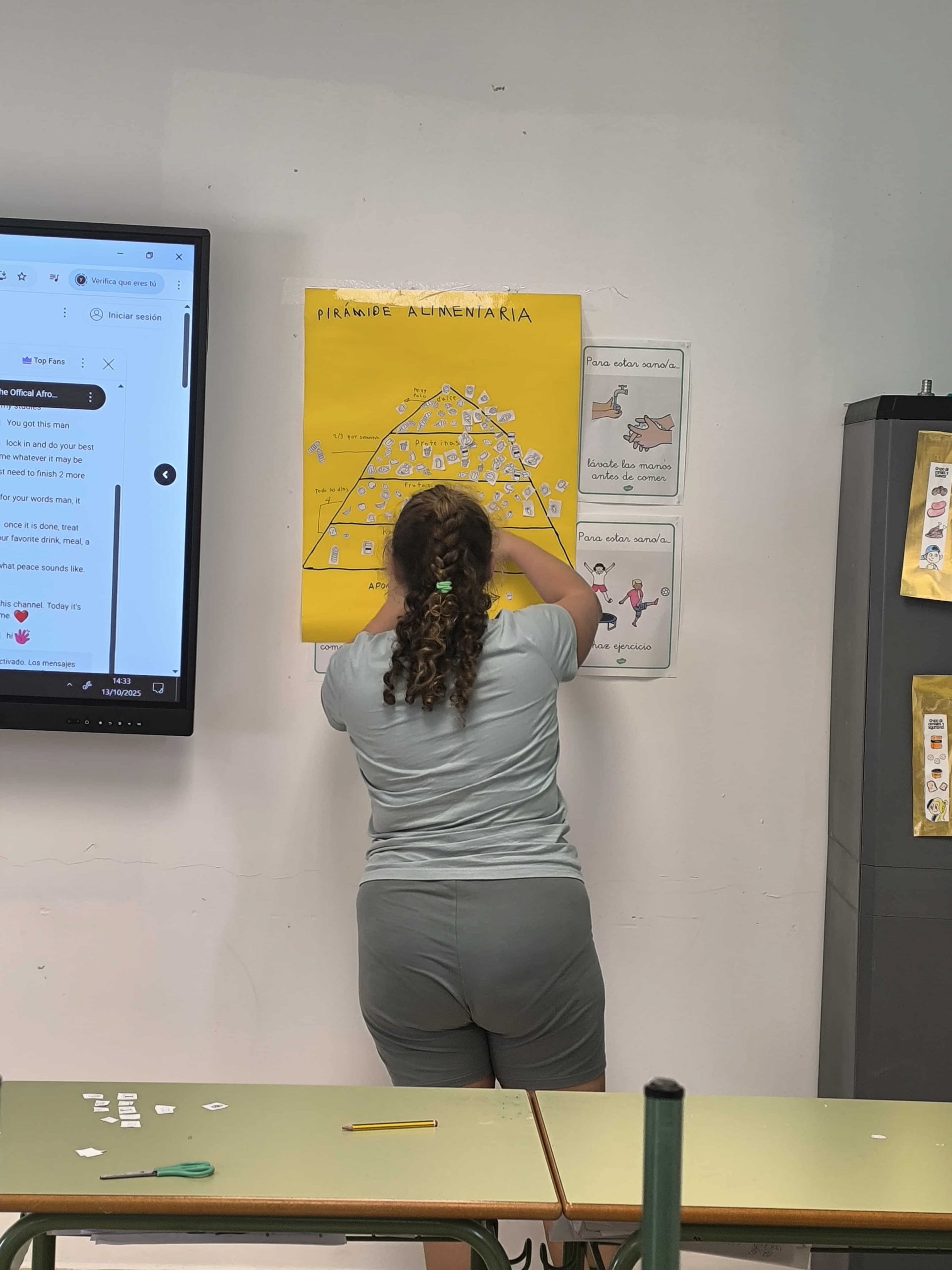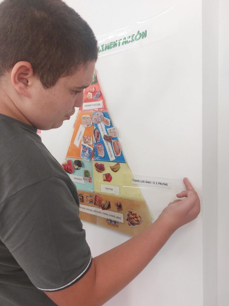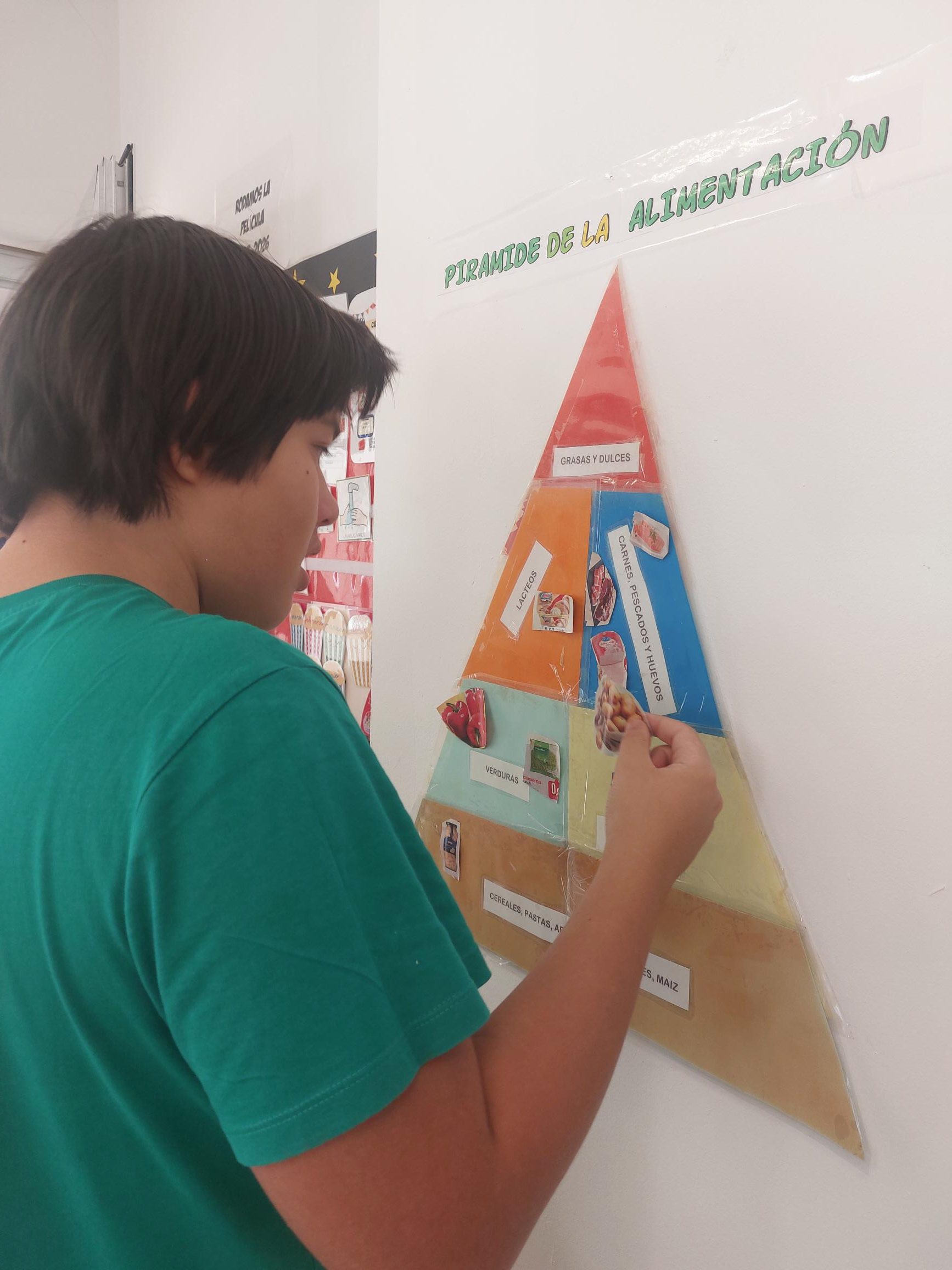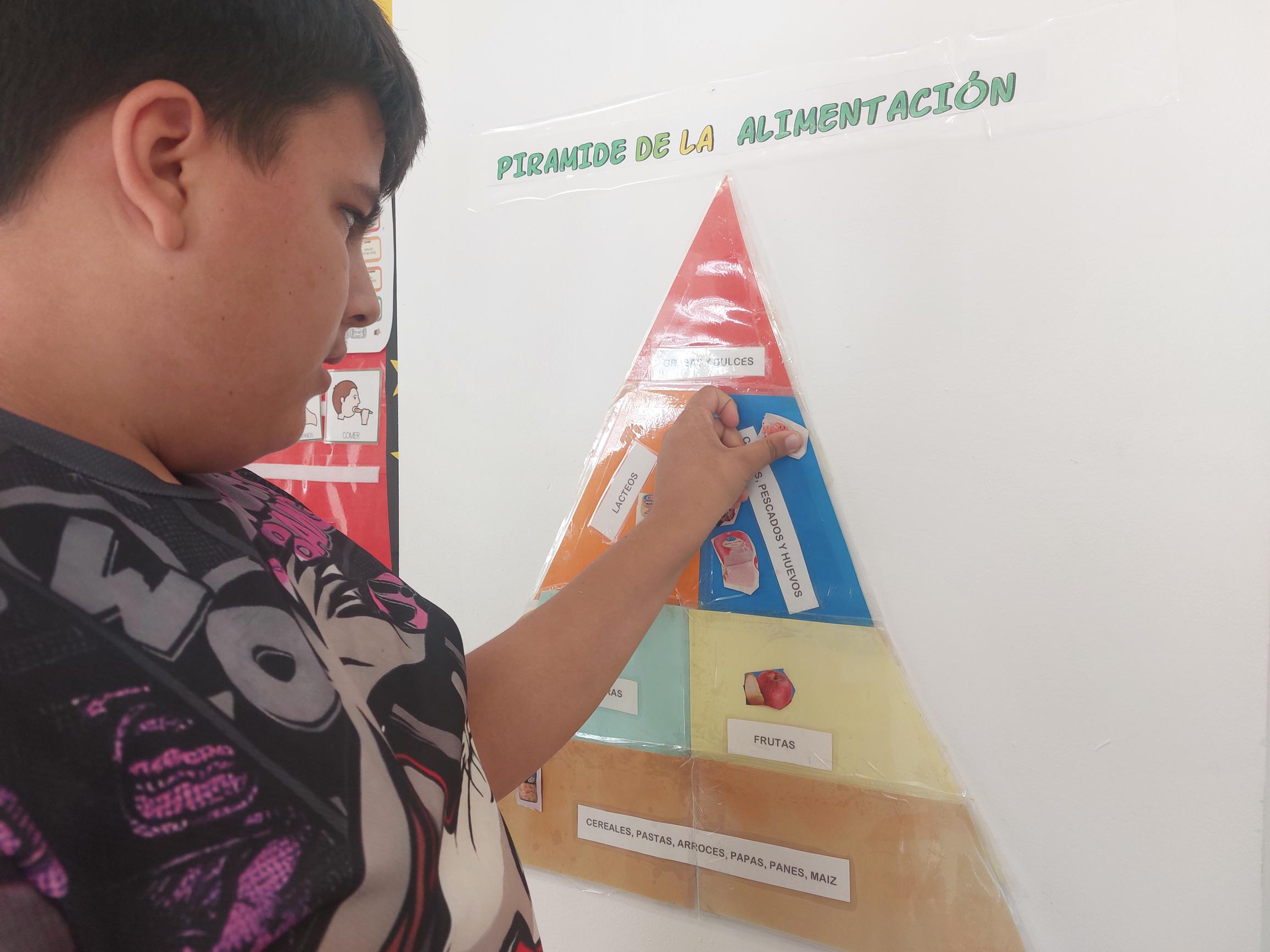 Cada alumno buscó, identificó y recortó diferentes alimentos para completar la pirámide de la alimentación entre todos.