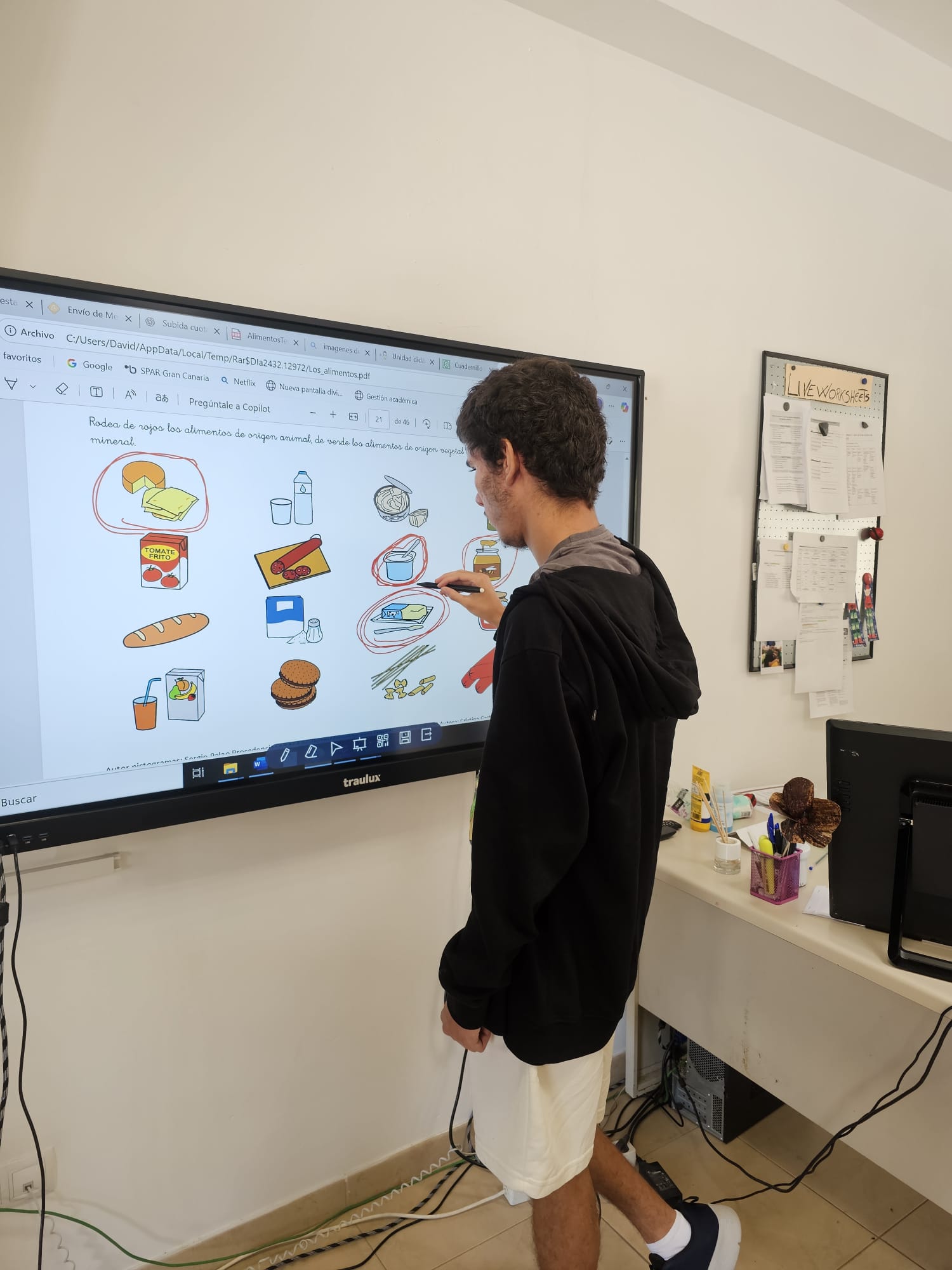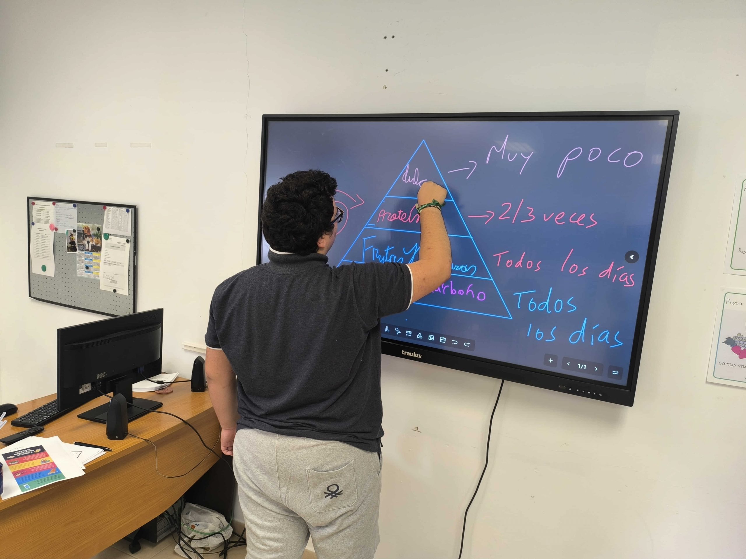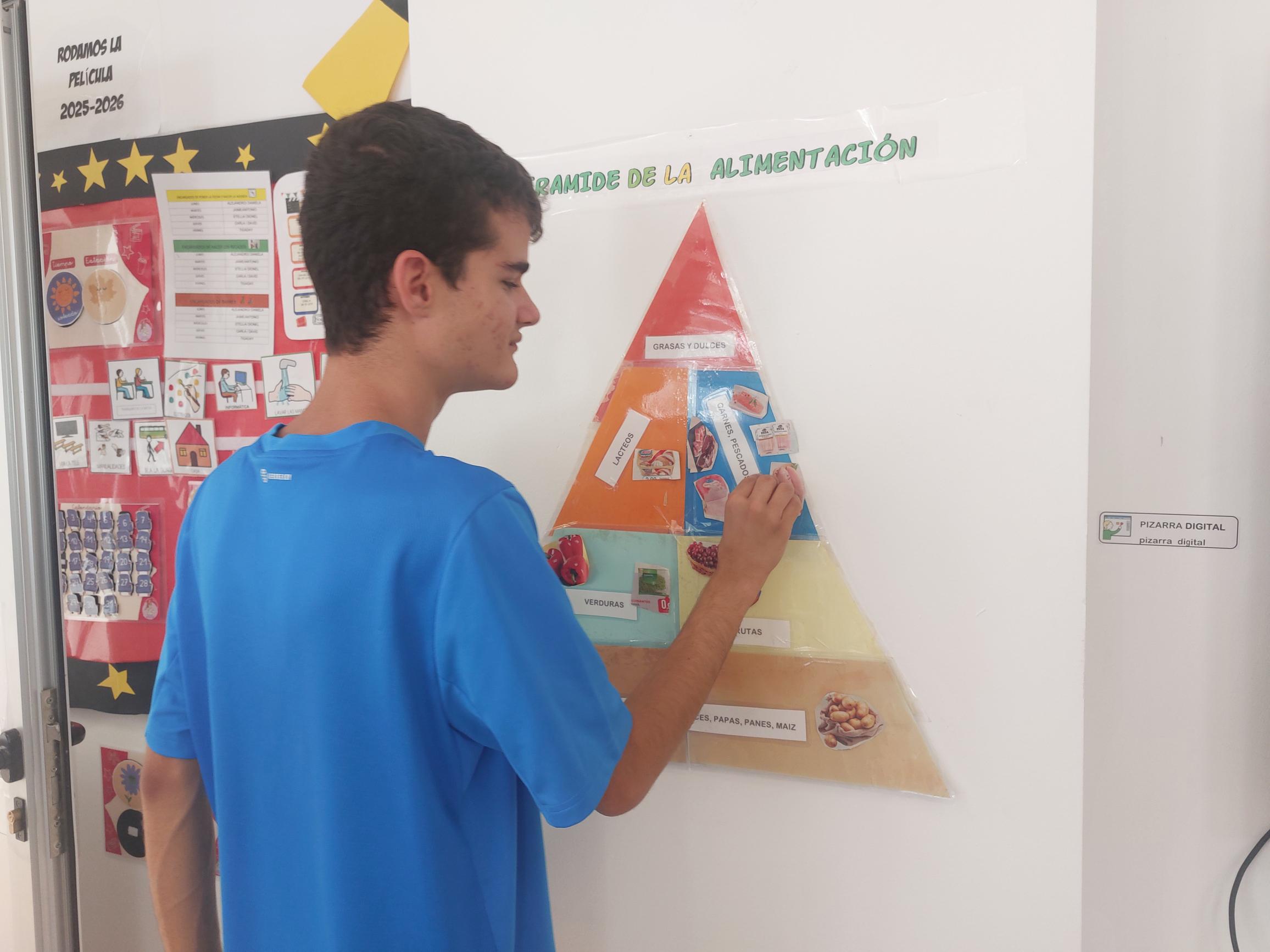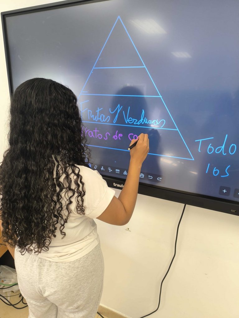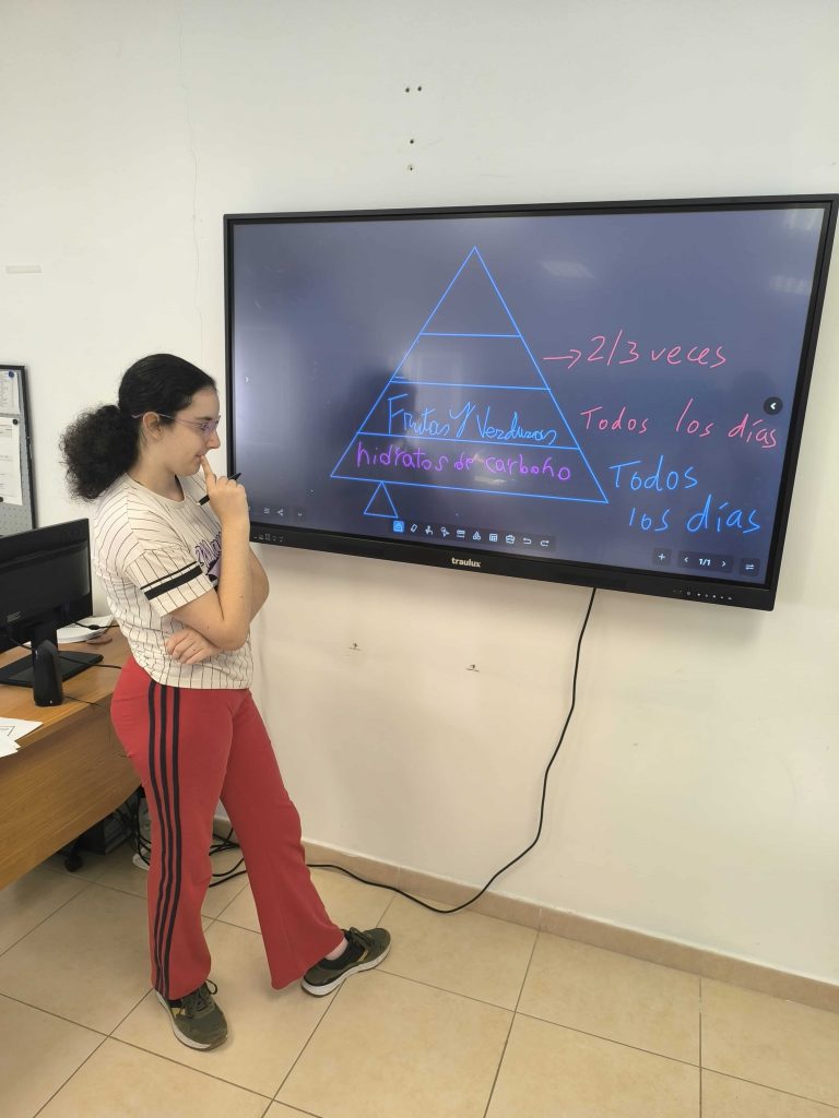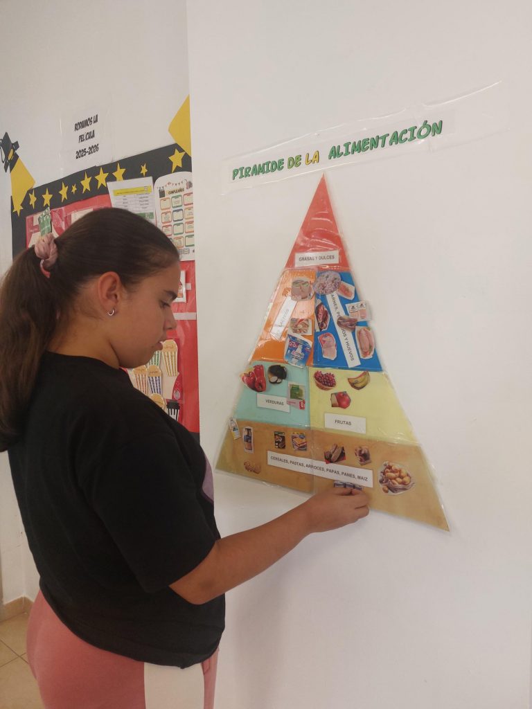 Utilizando la pizarra digital y material de recortar y pegar, el alumnado estudió la pirámide alimentaria, para entender que alimentos debemos consumir más y cuáles menos.