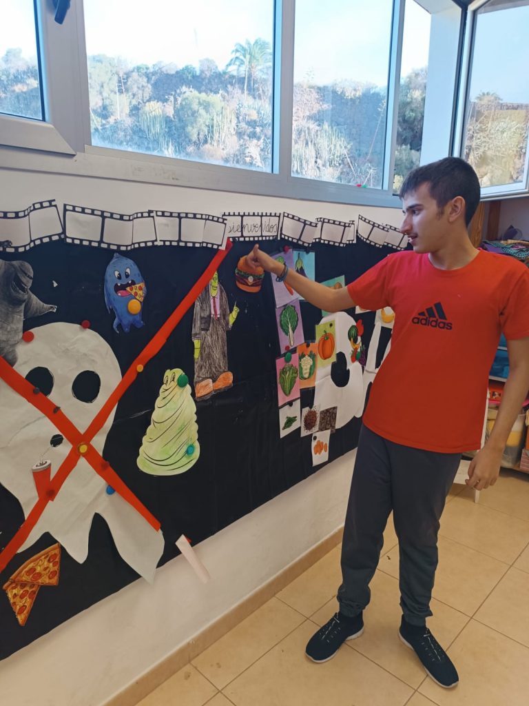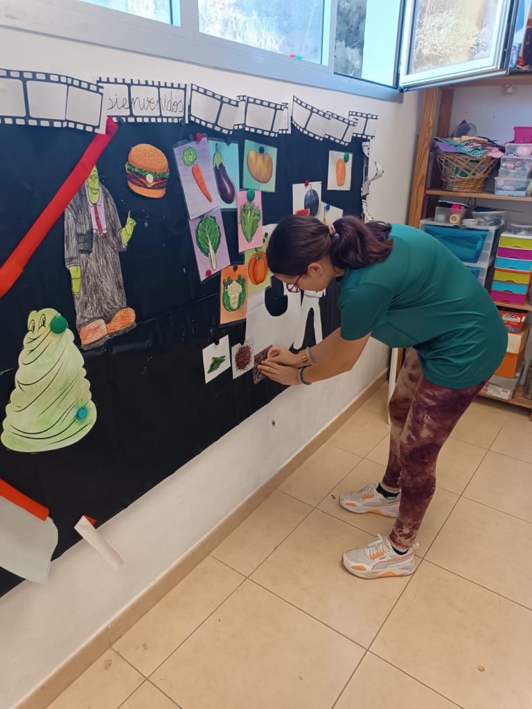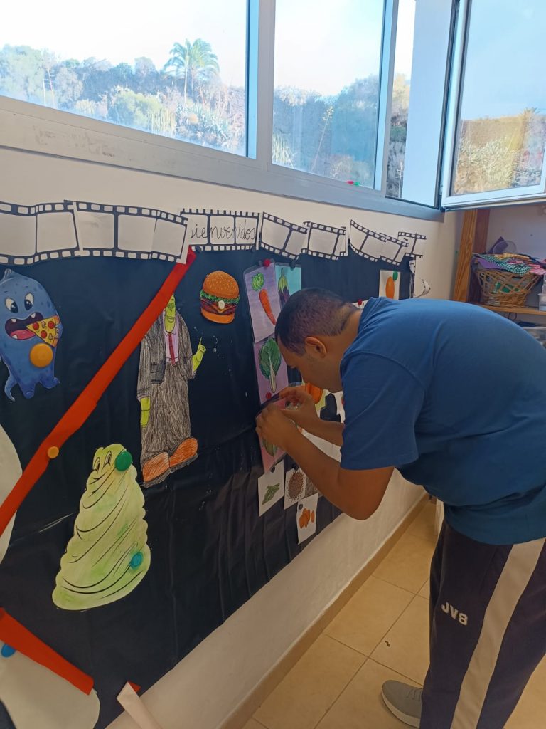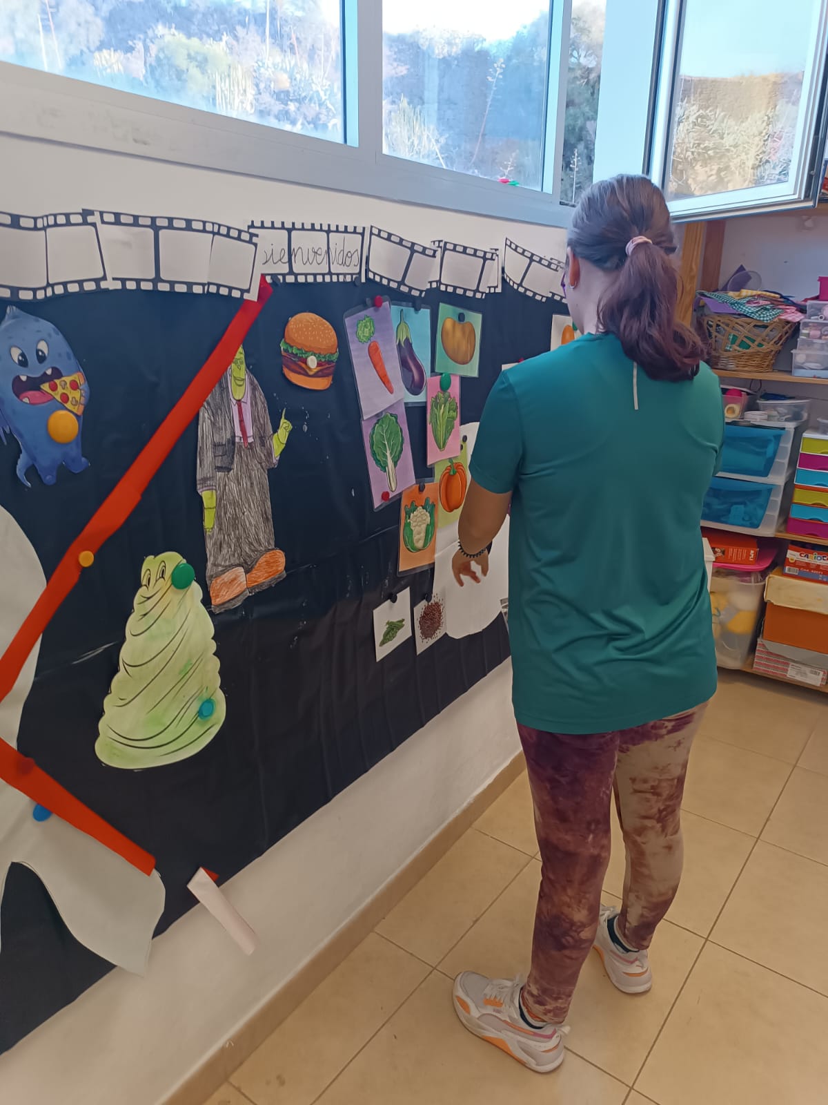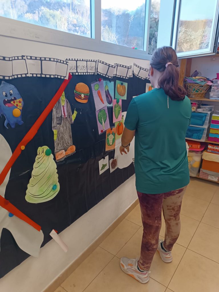 Hicieron una actividad grupal, realizando un gran mural en el aula, donde se veía claramente dos partes en el gran cartel alimentos sanos como la fruta, verduras y legumbres por una parte con un gran ok y por otra alineado con nuestro hilo conductor del cine personajes monstruosos que comen mal: pizza, refrescos, hamburguesas etc.