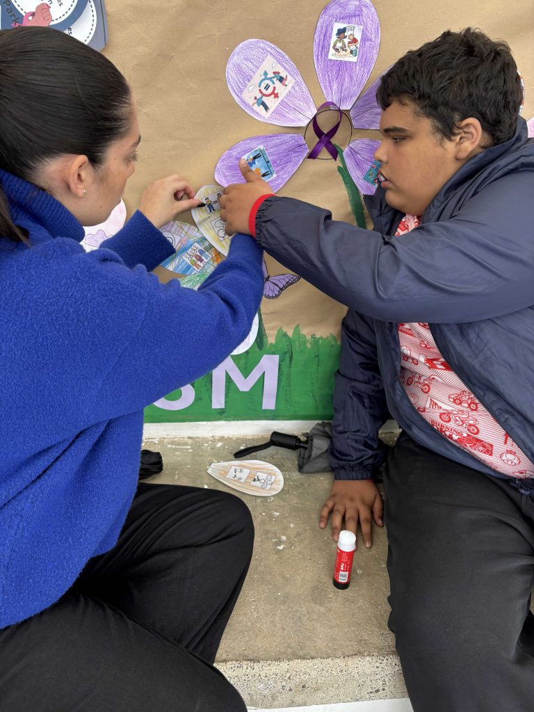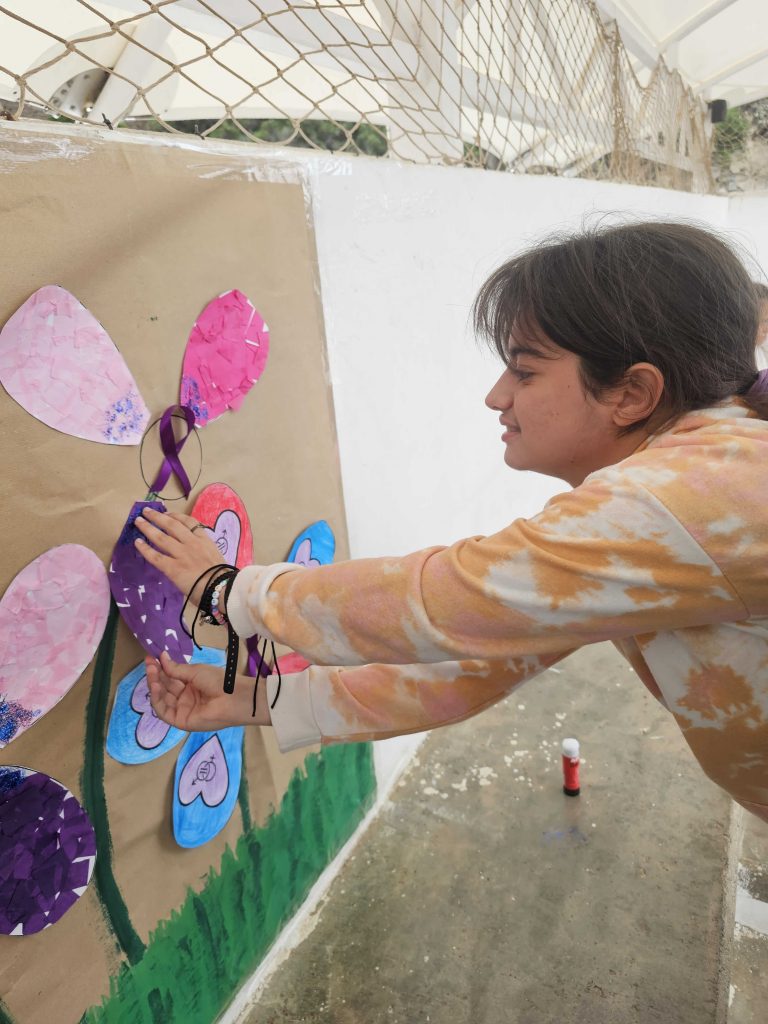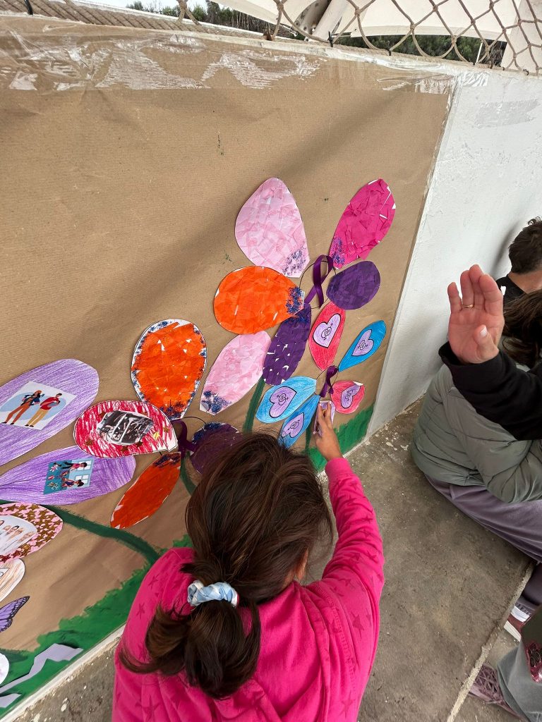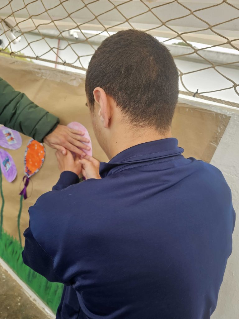 El lunes 9 de marzo, nos reunimos todos y todas en el patio para ir añadiendo los pétalos a las flores de nuestro jardín y luego nos hicimos una foto con nuestro maravilloso mural.
