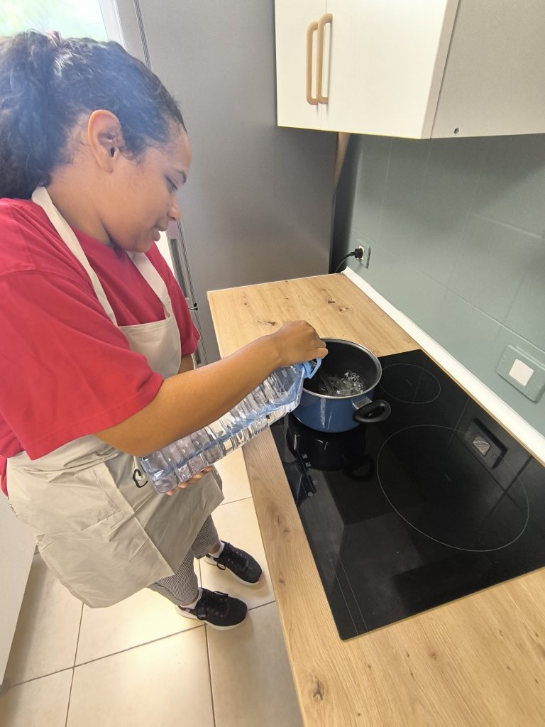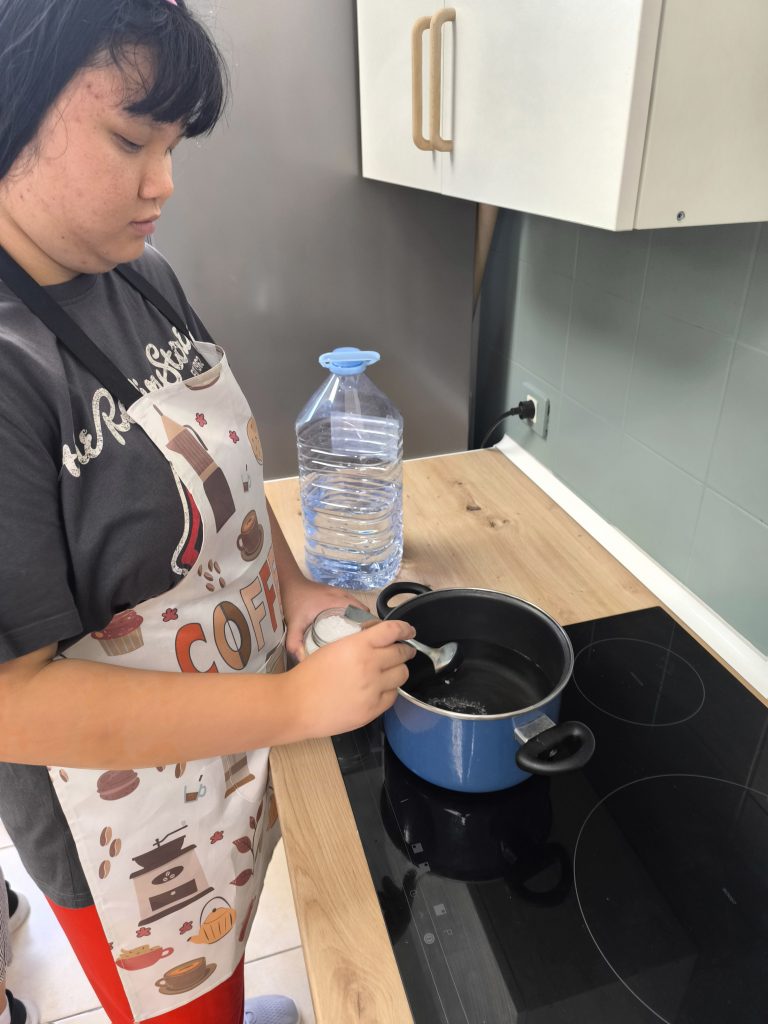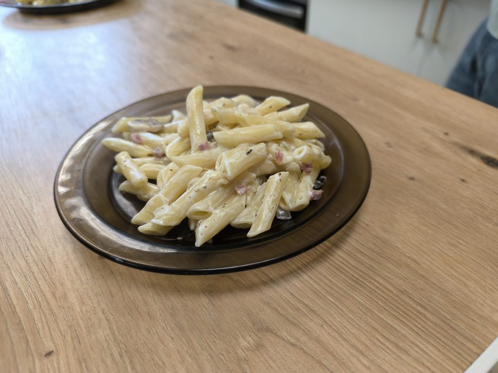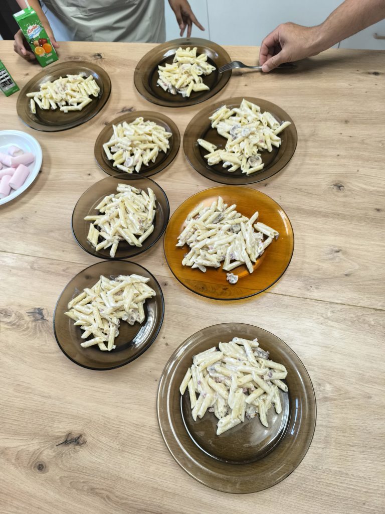 En la clase, cocinaron pasta con nata y bacon en el taller de cocina de la unidad H. Utilizaron ingredientes como nata, bacon, macarrones, aceite, sal y cebolla.