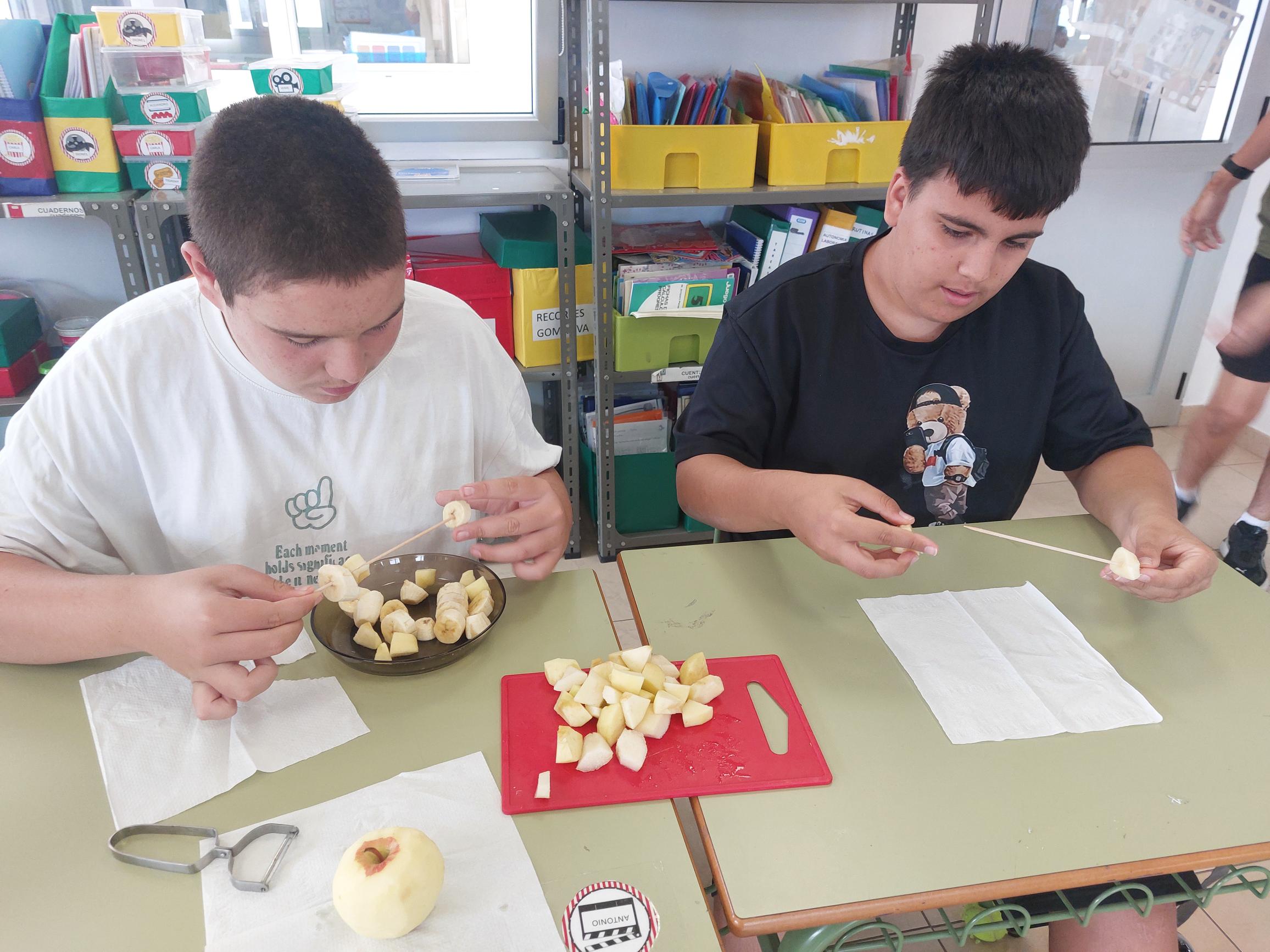 En el taller de cocina fría los compañeros hicieron un pincho de fruta que bañaron en chocolate. Utilizaron frutas como la manzana y el plátano.